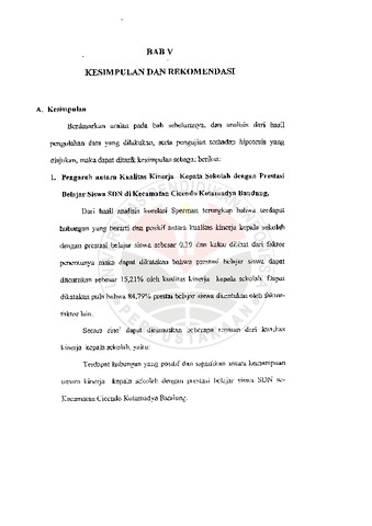 Hasil analisis data menemukan bahwa kualitas kinerja kepala sekolah berada pada kategori tinggi, kondisi PBM baik, sedangkan prestasi siswa memiliki rata-rata rendah. Adapun korelasi antara keduanya adalah terdapat korelasi yang signifikan dan positif antara kualitas kinerja kepala sekolah dengan prestasi belajar siswa SDN se-kecamatan Cicendo Kotamadya Bandung sebesar 0,39 dengan daya determinasi sebesar 15,2%. Artinya tingkat prestasi belajar siswa ditentukan sebesar 15,2% oleh kualitas kinerja kepala sekolah atau sebaliknya.