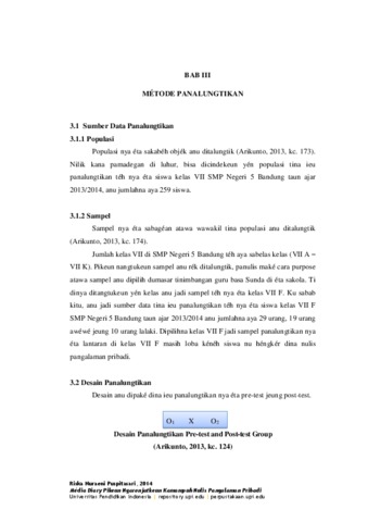 Penelitian ini bertujuan untuk mendeskripsikan meningkat atau tidaknya kemampuan menulis pengalaman pribadi siswa setelah menggunakan média diary. Penelitian ini dilatarbelakangi oleh pentingnya média pembelajaran untuk digunakan dalam kegiatan pengajaran bahasa Sunda, serta kegiatan menulis yang dianggap susah khususnya menulis dalam bahasa Sunda yang menyebabkan kemampuan siswa dalam menulis pengalaman pribadi dalam bahasa Sunda masih kurang. Metode yang digunakan dalam penelitian ini yaitu metode kuasi eksperimen dengan One-group pretest-posttest design dan téhnik tés. Instrumén yang digunakan dalam penelitian ini adalah lembar tes. Penelitian ini dilaksanakan di SMP Negeri 5 Bandung kelas VII F dengan jumlah siswa 29 orang, diantaranya yaitu 19 orang siswa perempuan dan 10 orang siswa laki-laki. Dari hasil penelitian bisa disimpulkan bahwa secara umum kemampuan menulis pengalaman pribadi siswa setelah menggunakan media diarymeningkat, hasil uji gain menunjukkan bahwa ada beda yang signifikan antara kemampuan menulis pengalaman pribadi siswa sebelum dan setelah menggunakan media diary yaitu meningkat dari 21% menjadi 76% dengan selisih 55%, dan dari uji hipotésis hasil (12,5) (2,47). Kesimpulannya, hipotesis dari penelitian ini yaitu ada beda antara kemampuan siswa kelas VII F SMP Negeri 5 Bandung Taun Ajaran 2013-2014 dalam menulis pengalaman pribadi sebelum dan setelah menggunakan media diary diterima dalam taraf signifikasi 99%. Artinya, média diary dapat meningkatkan kemampuan menulis pengalaman pribadi siswa kelas VII F SMP Negeri 5 Bandung Taun Ajaran 2013-2014.