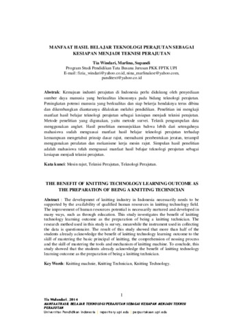 Windari, Tia (2014) MANFAAT HASIL BELAJAR TEKNOLOGI PERAJUTAN SEBAGAI KESIAPAN MENJADI TEKNISI PERAJUTAN. S1 thesis, Univeritas Pendidikan Indonesia.