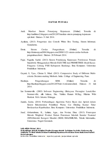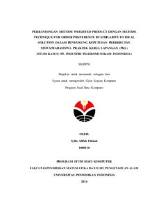 Fitriani, Syifa Afifah (2014) PERBANDINGAN METODE WEIGHTED PRODUCT DENGAN METODE TECHNIQUE FOR ORDER PREFERENCE BY SIMILARITY TO IDEAL SOLUTION DALAM PENDUKUNG KEPUTUSAN PEREKRUTAN SISWA/MAHASISWA PRAKTEK KERJA LAPANGAN. S1 thesis, Universitas Pendidikan Indonesia.