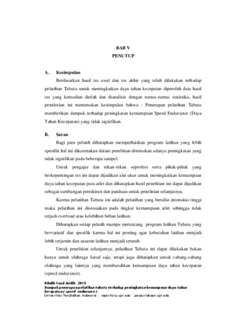 Based on the problem formulation and the writer’s purpose, the hypotheses the writer submit is tabata training gives a significant influence towards the increase of speed endurance ability. Based on the data processing and analysis, which is the women futsal players speed endurance ability in general, is increased. But, 6 players out of 18 didn’t increase. The conclusion from data processing and analysis is that tabata training gives a non significant increase towards speed endurance ability.