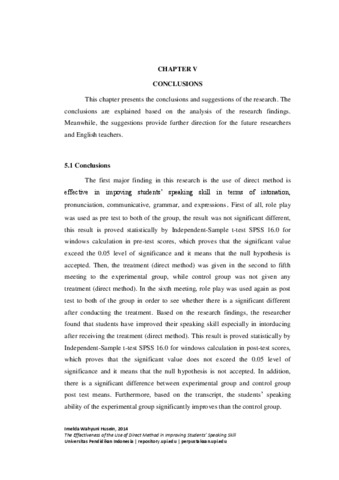 Husein, Imelda Wahyuni (2014) The Effectiveness of the Use of Direct Method in Improving Students’ Speaking Skill : A Quasi-Experimental Study of Tenth Grade Students in One of Vocational High Schools in Bandung. S1 thesis, Universitas Pendidikan Indonesia.