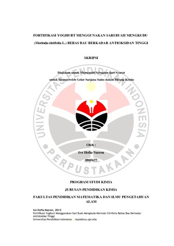 Nasren, Ivo Hofia (2013) FORTIFIKASI YOGHURT MENGGUNAKAN SARI BUAH MENGKUDU (MORINDA CITRIFOLIA L.) BEBAS BAU BERKADAR ANTIOKSIDAN TINGGI. S1 thesis, Universitas Pendidikan Indonesia.