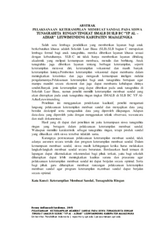 Surahman, Denny (2015) PELAKSANAAN KETERAMPILAN MEMBUAT SANDAL PADA SISWA TUNAGRAHITA RINGAN TINGKAT SMALB DI SLB BC “YP AL – AZHAR” LEUWIMUNDING KABUPATEN MAJALENGKA. S1 thesis, Universitas Pendidikan Indonesia.
