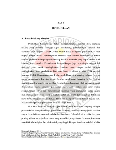 Girsang, Ermawati (2013) PENGARUH KEPEMIMPINAN TRANSFORMASIONAL KEPALA SEKOLAH DAN KINERJA GURU TERHADAP MUTU SEKOLAH PADA SMA SWASTA DI KOTA BANDUNG :Studi pada SMA Swasta yang Terakreditasi A. S2 thesis, Universitas Pendidikan Indonesia.