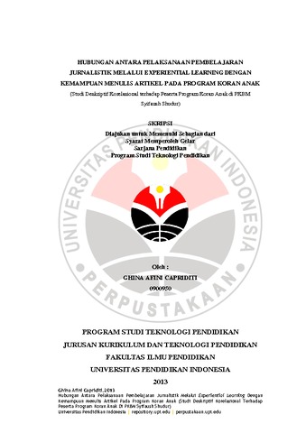 Skripsi Jurusan Kurikulum dan Teknologi Pendidikan, Fakultas Ilmu Pendidikan, Universitas Pendidikan Indonesia, Tahun 2013. Penelitian dilakukan berdasarkan studi pendahuluan dan observasi yang dilakukan peneliti di PKBM Syifaush Shudur dimana terdapat pembelajaran jurnalistik pada program koran guna melatih kemampuan menulis artikel. Hal yang menjadi daya tarik adalah dalam pembelajaran jurnalistik diterapkan metode experiential learning, dimana peserta didik dapat menjadi jurnalis. Penerapan experiential learning dilakukan untuk memberikan pengalaman konkret kepada peserta didik guna mencapai keberhasilan pembelajaran, termasuk kemampuan menulis artikel. Penelitian ini menjawab permasalahan penelitian yang telah dirumuskan, yaitu “Apakah terdapat hubungan yang signifikan antara pelaksanaan pembelajaran jurnalistik melalui experiential learning dengan kemampuan menulis artikel pada program koran anak di PKBM Syifaush Shudur?”. Secara lebih rinci rumusan masalah terdiri dari (1) Bagaimana pelaksanaan pembelajaran jurnalistik melalui experiential learning pada program koran anak di PKBM Syifaush Shudur?; (2) Bagaimana gambaran kemampuan peserta didik menulis artikel dalam pembelajaran jurnalistik pada program koran anak di PKBM Syifaush Shudur?; (3) Apakah terdapat hubungan yang signifikan antara pelaksanaan pembelajaran jurnalistik melalui experiential learning dengan kemampuan peserta didik menulis artikel pada program koran anak di PKBM Syifaush Shudur?. Penelitian ini menggunakan metode deskriptif korelasional dengan pendekatan kuantitatif. Instrumen penelitian yang digunakan berupa angket, wawancara dan studi dokumentasi. Teknik sampling yang digunakan adalah sampling jenuh dengan jumlah sampel sebanyak 30 orang. Teknik analisis data dilakukan dengan perhitungan skor total tiap instrumen, uji normalitas, analisis korelasi dan uji signifikansi. Berdasarkan hasil penelitian di lapangan, dapat diambil kesimpulan, bahwa (1) pelaksanaan pembelajaran jurnalistik melalui experiential learning di PKBM syifaush Shudur dapat berjalan sangat baik; (2) kemampuan peserta didik dalam menulis artikel dapat dikatakan baik dilihat dari aspek kebahasaan dan aspek artikel; (3) terdapat hubungan yang signifikan antara pelaksanaan pembelajaran jurnalistik melalui experiential learning dengan kemampuan menulis artikel pada program koran anak. Berdasarkan pernyataan tersebut maka diberikan rekomendasi, yaitu pembelajaran jurnalistik melalui experiential learning tetap dilaksanakan sesuai prosedur agar dapat tetap mencapai keberhasilan pembelajaran, khususnya kemampuan menulis artikel.
