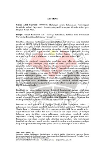 Capriditi, Ghina Afini (2013) HUBUNGAN ANTARA PELAKSANAAN PEMBELAJARAN JURNALISTIK MELALUI EXPERIENTIAL LEARNING DENGAN KEMAMPUAN MENULIS ARTIKEL PADA PROGRAM KORAN ANAK. S1 thesis, Universitas Pendidikan Indonesia.