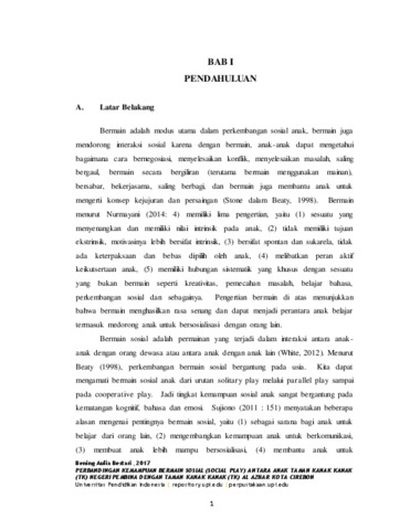 Bestari, Bening Aulia (2017) PERBANDINGAN KEMAMPUAN BERMAIN SOSIAL (SOCIAL PLAY) ANTARA ANAK TAMAN KANAK KANAK (TK) NEGERI PEMBINA DENGAN TAMAN KANAK KANAK (TK) AL AZHAR KOTA CIREBON. S1 thesis, Universitas Pendidikan Indonesia.