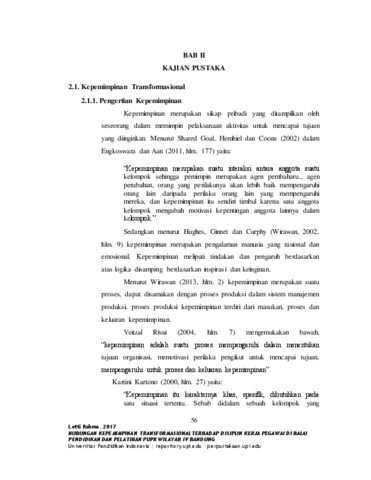 Rahma, Letti (2017) HUBUNGAN KEPEMIMPINAN TRANSFORMASIONAL TERHADAP DISIPLIN KERJA PEGAWAI DI BALAI PENDIDIKAN DAN PELATIHAN PUPR WILAYAH IV BANDUNG. S1 thesis, Universitas Pendidikan Indonesia.