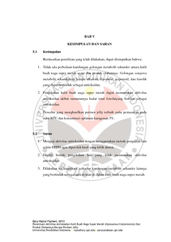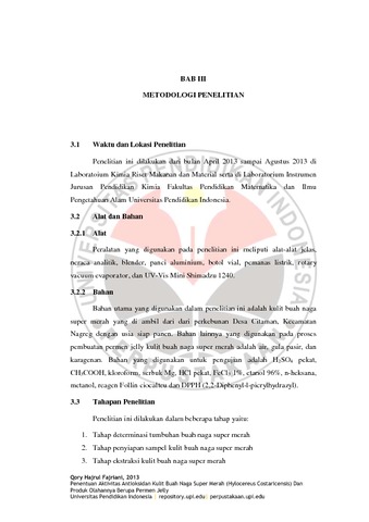 Fajriani, Qory Hajrul (2013) PENENTUAN AKTIVITAS ANTIOKSIDAN KULIT BUAH NAGA SUPER MERAH (HYLOCEREUS COSTARICENSIS) DAN PRODUK OLAHANNYA BERUPA PERMEN JELLY. S1 thesis, Universitas Pendidikan Indonesia.