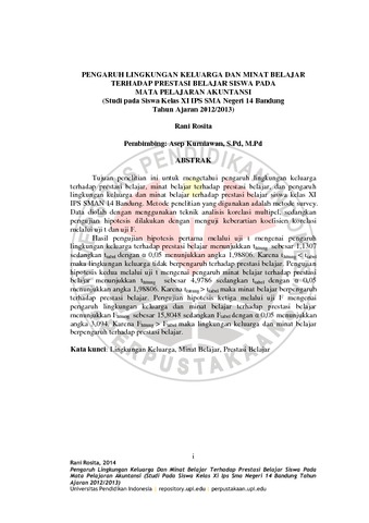Rosita, Rani (2014) PENGARUH LINGKUNGAN KELUARGA DAN MINAT BELAJAR TERHADAP PRESTASI BELAJAR SISWA PADA MATA PELAJARAN AKUNTANSI : Studi Pada Siswa Kelas Xi IPS SMA Negeri 14 Bandung Tahun Ajaran 2012/2013. S1 thesis, Universitas Pendidikan Indonesia.